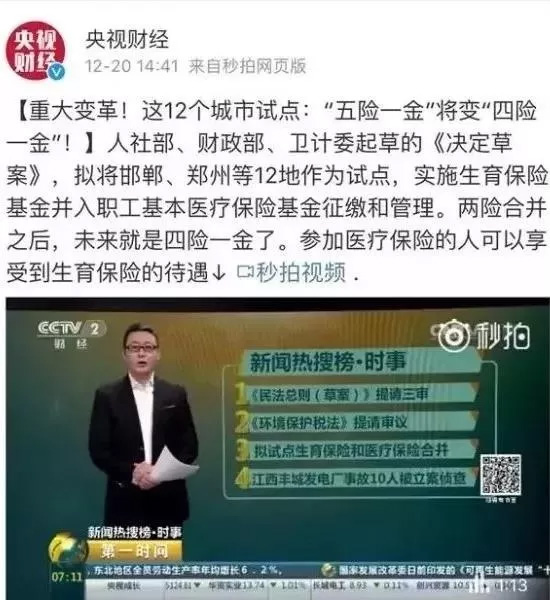 01、重磅!五險將變?yōu)樗碾U 早在2016年,國務(wù)院就對重慶、內(nèi)江、昆明、岳陽、鄭州、威海、合肥、泰州、沈陽、邯鄲、晉中這12個城市進(jìn)行試點,實施生育保險并入醫(yī)療保險基金征繳和管理,試點時間為:2年。