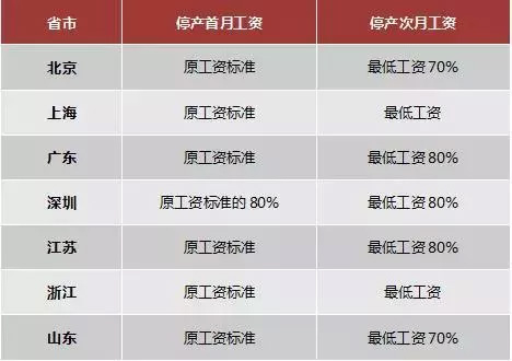 困難企業的勞動關系和工資怎么處理? 對于受疫情影響生產經營的困難企業的勞動關系、工資支付等規定,那又是怎么樣的呢? 根據通知:企業因受疫情影響導致生產經營困難的,可以通過與職工協商一致采取調整薪酬、輪崗輪休、縮短工時等方式穩定工作崗位,盡量不裁員或者少裁員。符合條件的企業,可按規定享受穩崗補貼。 如果停產的第一個月按照原工資支付,進入待崗期,企業發放生活費,標準按照各省市規定執行。符合規定條件的企業,可申領穩崗補貼。 北京規定:根據《北京市工資支付規定》第27條,用人單位沒有安排勞動者工作的,應當按照不低于本市最低工資標準的70%支付勞動者基本生活費。 附圖:部分省市停工停產工資一覽表