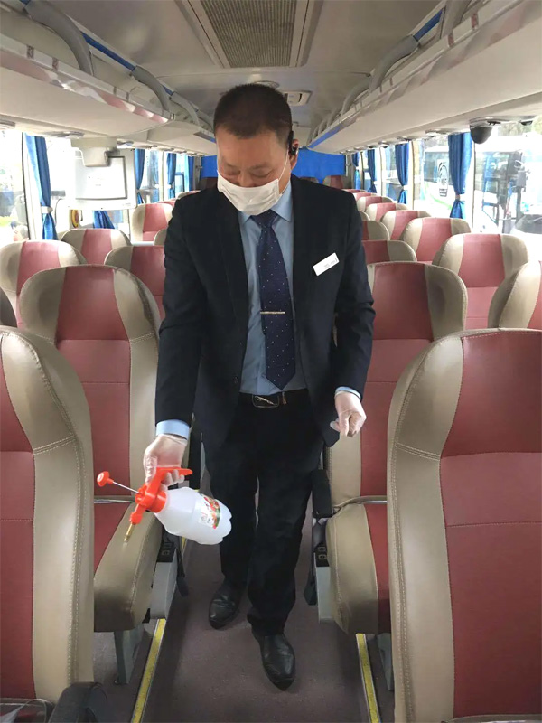 工作人員正在對大巴進行全面消毒 方案策劃確認落實,我們始終與客戶保持密切溝通,在短短幾小時內(nèi)便確定好首批返杭專車的員工名單,聯(lián)系好專車大巴,21號下午首輛復工專車終于駛出。 據(jù)杭州仁本伍總介紹:此次過程中為了降低人員返程運輸?shù)囊咔閭鞑ワL險,都在大巴車上配備了生活物資和防疫物資,并在行前對車輛進行了全面的消毒。車上員工都安排前后錯開坐,保持安全的距離,盡量做好每一步防護,確保員工的安全。這一批返杭員工也將在這兩天安排體檢,沒有問題就可以上崗復工了。