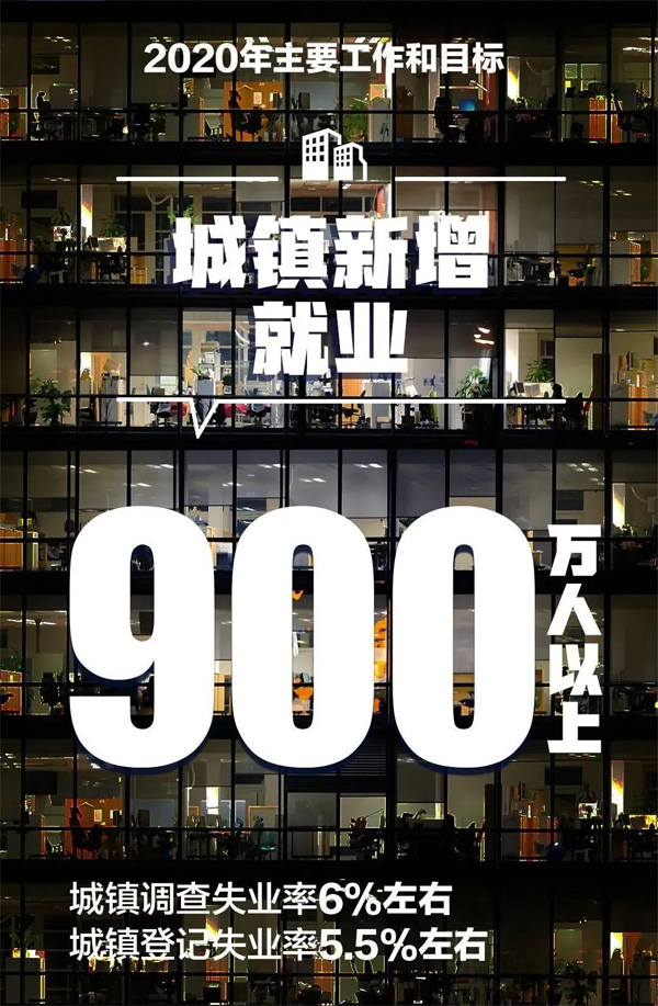 2020年,城鎮新增就業900萬人以上,城鎮調查失業率6%左右,城鎮登記失業率5.5%左右。