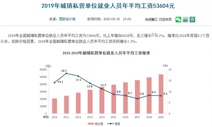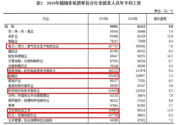 據(jù)統(tǒng)計(jì)局?jǐn)?shù)據(jù):2019年全國城鎮(zhèn)非私營單位就業(yè)人員年平均工資為90501元,比上年增長9.8%,扣除價(jià)格因素,實(shí)際增長6.8%;城鎮(zhèn)私營單位就業(yè)人員年平均工資為53604元,比上年增長8.1%,扣除價(jià)格因素,實(shí)際增長5.2%。 大家需要注意的是,非私營單位并非就是國企。而是指:國有企業(yè),外資企業(yè),港澳臺資企業(yè),股份制公司和集體企業(yè)。非私營單位≠體制內(nèi)單位。簡單說非私營單位指國有單位+大中型公司,像我們耳熟能詳?shù)尿v訊阿里巴巴小米、蘋果三星中石油都屬于統(tǒng)計(jì)概念里的“非私營單位”。 01 數(shù)據(jù)中的四大變化 從數(shù)據(jù)上看,2019年的數(shù)據(jù)有如下主要變化:城鎮(zhèn)非私營單位年平均工資超過9萬元;其中IT業(yè)年平均工資超16萬元,連續(xù)4年雄踞第一;曾經(jīng)的高富帥行業(yè)金融業(yè)被“科學(xué)家們”反超,淪為第三;6大行業(yè)年平均工資超10萬元。 變化1、城鎮(zhèn)非私營單位年平均工資超9萬元,城鎮(zhèn)私營單位就業(yè)人員年平均工資超5萬元。 據(jù)中國勞動(dòng)學(xué)會特約研究員蘇海南此前對中新網(wǎng)記者分析,非私營單位包括國企、外企等,大中型企業(yè)居多,效益比較好,而私營企業(yè)多數(shù)是勞動(dòng)密集型中小企業(yè),勞動(dòng)生產(chǎn)率低于非私營企業(yè),勞動(dòng)者議價(jià)能力也不強(qiáng),導(dǎo)致工資水平明顯低于前者。 變化2、6大行業(yè)年平均工資超10萬元。 總體來看,在城鎮(zhèn)非私營單位中,有6個(gè)行業(yè)的年平均工資水平超過了10萬元大關(guān),比2018年增加了2個(gè)。
