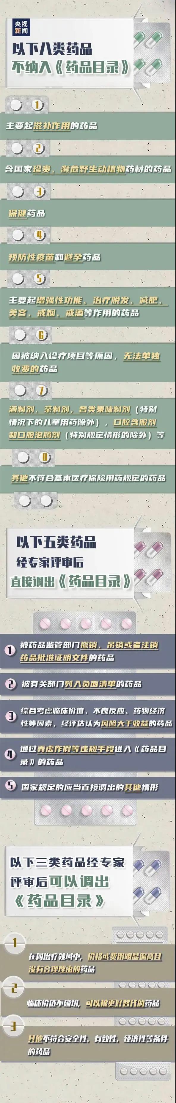 另外辦法明確了包括預(yù)防性疫苗,滋補藥品,保健藥品,脫發(fā)、美容減肥類等在內(nèi)的八類不得進入《藥品目錄》的藥品;規(guī)定了醫(yī)?;鸬闹Ц掇k法等。 日常就醫(yī)問藥時 還有哪些藥品不可報銷? 藥品調(diào)入、出《藥品目錄》的標準是啥? 哪些可以用醫(yī)保基金支付? 一圖了解↓