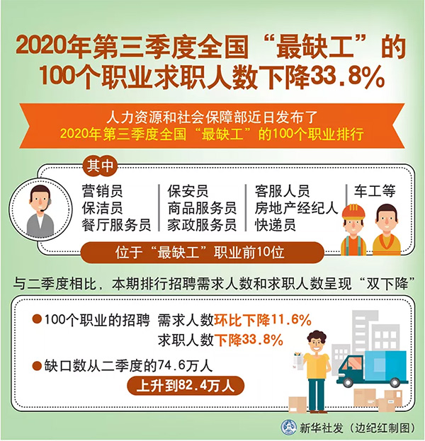 近日,人力資源和社會保障部近日發布了2020年第三季度全國“最缺工”的100個職業排行。