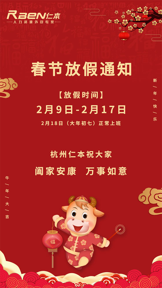 致全體客戶、派遣員工: 春節(jié)將至,忙忙碌碌的一年即將過(guò)去,馬上就要迎來(lái)全新的辛丑牛年!首先向各位仁本的合作伙伴和全體員工致以節(jié)日的問(wèn)候。 杭州仁本春節(jié)假期為: 2021年2月9日——2021年2月17日 2月18日(大年初七)正式上班