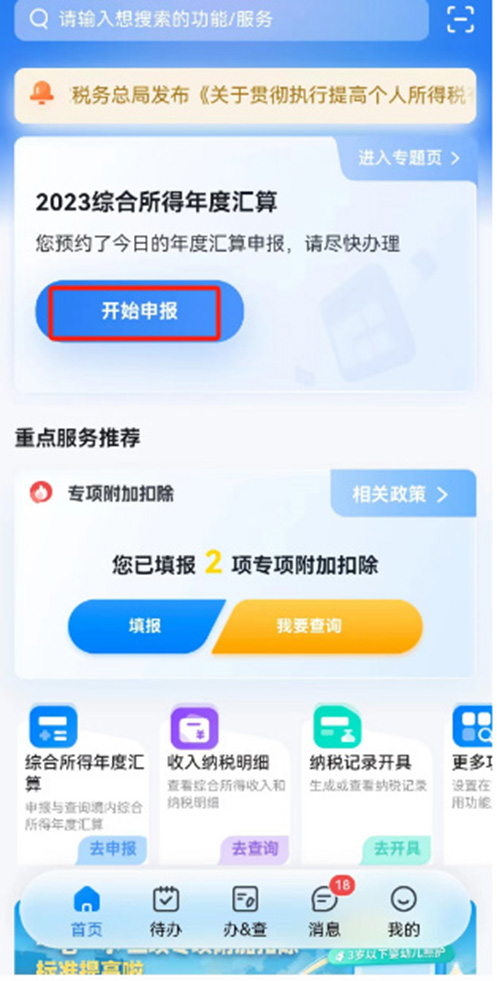 有預(yù)約的,可以在預(yù)約時(shí)間辦理,進(jìn)入【個(gè)人所得稅APP】首頁(yè),點(diǎn)擊【開(kāi)始申報(bào)】開(kāi)啟2023個(gè)稅匯算清繳。 沒(méi)有預(yù)約的,先進(jìn)行預(yù)約。
