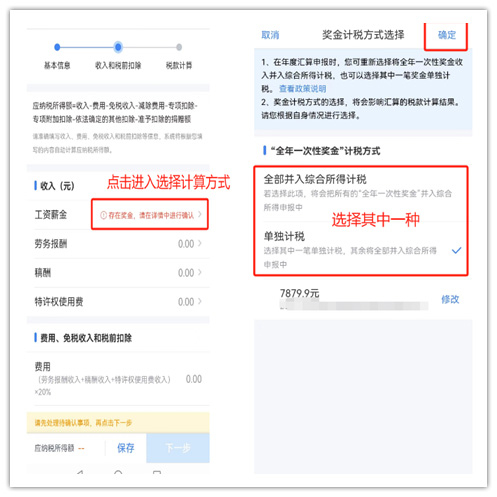 要辨別獎(jiǎng)金哪種計(jì)稅方法對(duì)自己更有利,一個(gè)最簡(jiǎn)單方法是,在個(gè)稅APP中先選擇某一種計(jì)稅方式,看看最終匯算后的交稅金額,然后不要確認(rèn),返回再選擇另一種計(jì)稅方式,比較兩種方式下,哪種稅額小,就選擇哪種。