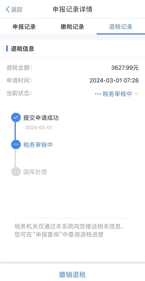 若您存在多交稅款,可點(diǎn)擊【申請(qǐng)退稅】,稅務(wù)審核后會(huì)匯款給個(gè)人銀行卡。