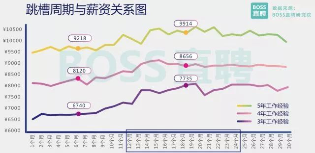 前一份工作持續12-24個月的求職者是跳槽大軍主要漲薪人群 跳槽旺季中,漲薪是眾多求職者的主要訴求之一。 BOSS直聘研究院數據顯示,上一份工作堅持不到6個月又再次跳槽的求職者中,超六成人的薪資低于同齡求職者均值。 從職場人目前薪酬水平與前一份工作時長的關系來看,前一份工作時長在12-24個月的求職者,跳槽后所獲得的薪資相對最高。