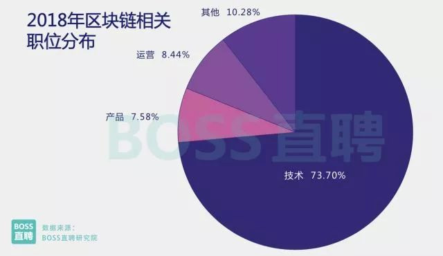 與海外相比,國內區塊鏈人才供應增長態勢較為穩定。2018年前兩個月,人才供應量同比增加235%,增速 雖高于其他互聯網職位,但存量仍遠低于實際需求。 截至2018年2月,專業區塊鏈技術人才的供需比僅為0.15,嚴重不足(人工智能相關人才的供需比為0.62。 人才供需比低于1說明人才供不應求,數值越低表明缺口越高)。 2017年11月之前,區塊鏈相關崗位的平均招聘薪資為2.32萬元。2017年11月之后,區塊鏈相關崗位的平均 招聘薪資達到2.58萬元。 2、區塊鏈相關崗位類型和地域分布 區塊鏈成為風口之后,圈內不可避免地出現一些掛羊頭賣狗肉的蹭風口型崗位,只是加上區塊鏈三個字, 薪資便能提升一截。 然而BOSS直聘研究院通過技能與職位相關性分析發現,目前市面上的擦邊球崗位并不多, 90%的職位為專業區塊鏈相關崗位。 從職位分布上看,有73.7%的區塊鏈相關崗位為技術類,7.5%為產品類、 8.4%為運營類,還有10%其他崗位(包括行業分析師、市場推廣、記者等)。
