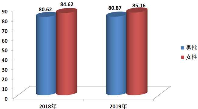杭州市男性、女性人均期望壽命有差別,差距有所擴(kuò)大。其中2019年全市男性人均期望壽命為80.87歲,女性85.16歲,比2018年分別增加0.25歲和0.54歲。男女人均期望壽命差距為4.29歲,比2018年4歲差距擴(kuò)大了0.29歲。 重大慢性病過早死亡率為7.20%