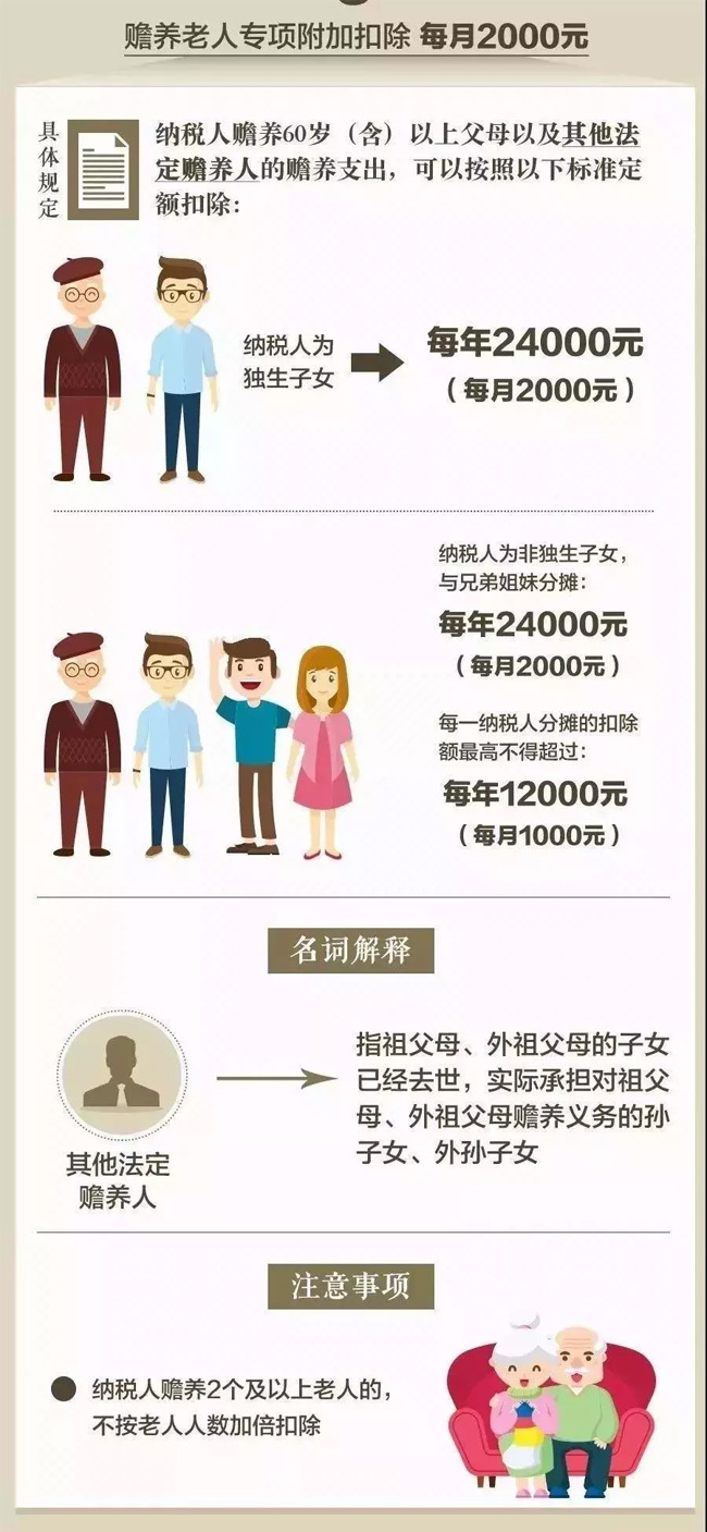 個(gè)稅贍養(yǎng)老人專項(xiàng)附加扣除 18個(gè)熱點(diǎn)問答 1.贍養(yǎng)老人專項(xiàng)附加扣除的扣除范圍是怎么規(guī)定的? 仁本解答:納稅人贍養(yǎng)年滿60歲父母以及子女均已去世的年滿60歲祖父母、外祖父母的贍養(yǎng)支出,可以稅前扣除。 2.贍養(yǎng)老人專項(xiàng)附加扣除的扣除標(biāo)準(zhǔn)是怎么規(guī)定的? 仁本解答:納稅人為獨(dú)生子女的,按照每月2000元的標(biāo)準(zhǔn)定額扣除。納稅人為非獨(dú)生子女的,應(yīng)當(dāng)與其兄弟姐妹分?jǐn)偯吭?000元的扣除額度,分?jǐn)偟目鄢~最高不得超過每月1000元。 3.贍養(yǎng)老人專項(xiàng)附加扣除的分?jǐn)偡绞接心膸追N? 仁本解答:贍養(yǎng)老人專項(xiàng)附加扣除的分?jǐn)偡绞桨ㄓ少狆B(yǎng)人均攤或約定分?jǐn)偅部梢杂杀毁狆B(yǎng)人指定分?jǐn)偂2扇≈付ǚ謹(jǐn)偦蛘呒s定分?jǐn)偡绞降模恳患{稅人分?jǐn)偟目鄢~最高不得超過每月1000元,并簽訂書面分?jǐn)倕f(xié)議。指定分?jǐn)偱c約定分?jǐn)偛灰恢碌模灾付ǚ謹(jǐn)倿闇?zhǔn)。 4.贍養(yǎng)老人專項(xiàng)附加扣除的扣除方式是怎樣的? 仁本解答:贍養(yǎng)老人專項(xiàng)附加扣除采取定額標(biāo)準(zhǔn)扣除方式。 5.贍養(yǎng)老人專項(xiàng)附加扣除的扣除主體是誰? 仁本解答:贍養(yǎng)老人專項(xiàng)附加扣除的扣除主體包括:一是負(fù)有贍養(yǎng)義務(wù)的所有子女。《婚姻法》規(guī)定:婚生子女、非婚生子女、養(yǎng)子女、繼子女有贍養(yǎng)扶助父母的義務(wù)。二是祖父母、外祖父母的子女均已經(jīng)去世,負(fù)有贍養(yǎng)義務(wù)的孫子女、外孫子女。 6.納稅人父母年齡均超過60周歲,在進(jìn)行贍養(yǎng)老人扣除時(shí),是否可以按照兩倍標(biāo)準(zhǔn)扣除? 仁本解答:不能。扣除標(biāo)準(zhǔn)是按照每個(gè)納稅人有兩位贍養(yǎng)老人測算的。只要父母其中一位達(dá)到60歲就可以享受扣除,不按照老人人數(shù)計(jì)算。 7.由于納稅人的叔叔伯伯無子女,納稅人實(shí)際承擔(dān)對叔叔伯伯的贍養(yǎng)義務(wù),是否可以扣除贍養(yǎng)老人支出? 仁本解答:不可以。被贍養(yǎng)人是指年滿60歲的父母,以及子女均已去世的年滿60歲的祖父母、外祖父母。 8.贍養(yǎng)老人的分?jǐn)偪鄢欠裥枰蚨悇?wù)機(jī)關(guān)報(bào)送協(xié)議? 仁本解答:納稅人之間贍養(yǎng)老人支出采用分?jǐn)偪鄢模绻蔷鶖偅值芙忝弥g不需要再簽訂書面協(xié)議,也無需向稅務(wù)機(jī)關(guān)報(bào)送。如果采取約定分?jǐn)偦蛘呃先酥付ǚ謹(jǐn)偟姆绞剑枰炗啎鎱f(xié)議,書面協(xié)議不需要向稅務(wù)機(jī)關(guān)或者扣繳義務(wù)人報(bào)送,自行留存?zhèn)洳椤?br/> 9.贍養(yǎng)岳父岳母或公婆的費(fèi)用是否可以享受個(gè)人所得稅附加扣除? 仁本解答:不可以。被贍養(yǎng)人是指年滿60歲的父母,以及子女均已去世的年滿60歲的祖父母、外祖父母。 10.父母均要滿60歲,還是只要一位滿60歲即可? 仁本解答:父母中有一位年滿60周歲的,納稅人可以按照規(guī)定標(biāo)準(zhǔn)扣除。 11.獨(dú)生子女家庭,父母離異后再婚的,如何享受贍養(yǎng)老人專項(xiàng)附加扣除? 仁本解答:對于獨(dú)生子女家庭,父母離異后重新組建家庭,在新組建的兩個(gè)家庭中,只要父母中一方?jīng)]有納稅人以外的其他子女進(jìn)行贍養(yǎng),則納稅人可以按照獨(dú)生子女標(biāo)準(zhǔn)享受每月2000元贍養(yǎng)老人專項(xiàng)附加扣除。除上述情形外,不能按照獨(dú)生子女享受扣除。在填寫專項(xiàng)附加扣除信息表時(shí),納稅人需注明與被贍養(yǎng)人的關(guān)系。 12.雙胞胎是否可以按照獨(dú)生子女享受贍養(yǎng)老人扣除? 仁本解答:雙胞胎不可以按照獨(dú)生子女享受贍養(yǎng)老人扣除。雙胞胎兄弟姐妹需要共同贍養(yǎng)父母,雙胞胎中任何一方都不是父母的唯一贍養(yǎng)人,因此每個(gè)子女不能獨(dú)自2000元的扣除額度。 13.生父母有兩個(gè)子女,將其中一個(gè)過繼給養(yǎng)父母,養(yǎng)父母家沒有其他子女,被過繼的子女屬于獨(dú)生子女嗎?留在原家庭的孩子,屬于獨(dú)生子女嗎? 仁本解答:被過繼的子女,在新家庭中屬于獨(dú)生子女。留在原家庭的孩子,如沒有兄弟姐妹與其一起承擔(dān)贍養(yǎng)生父母的義務(wù),也可以按照獨(dú)生子女標(biāo)準(zhǔn)享受扣除。 14.非獨(dú)生子女的兄弟姐妹都已去世,是否可以按獨(dú)生子女贍養(yǎng)老人扣除2000元/月? 仁本解答:一個(gè)納稅年度內(nèi),如納稅人的其他兄弟姐妹均已去世,其可在第二年按照獨(dú)生子女贍養(yǎng)老人標(biāo)準(zhǔn)2000元/月扣除。如納稅人的兄弟姐妹在2019年1月1日以前均已去世,則選擇按“獨(dú)生子女”身份享受贍養(yǎng)老人扣除標(biāo)準(zhǔn);如納稅人已按“非獨(dú)生子女”身份填報(bào),可修改已申報(bào)信息,1月按非獨(dú)生子女身份扣除少享受的部分,可以在下月領(lǐng)工資時(shí)補(bǔ)扣除。 15.子女均已去世的年滿60歲的祖父母、外祖父母,孫子女、外孫子女能否按照獨(dú)生子女扣除,如何判斷? 仁本解答:只要祖父母、外祖父母中的任何一方,沒有納稅人以外的其他孫子女、外孫子女共同贍養(yǎng),則納稅人可以按照獨(dú)生子女扣除。如果還有其他的孫子女、外孫子女與納稅人共同贍養(yǎng)祖父母、外祖父母,則納稅人