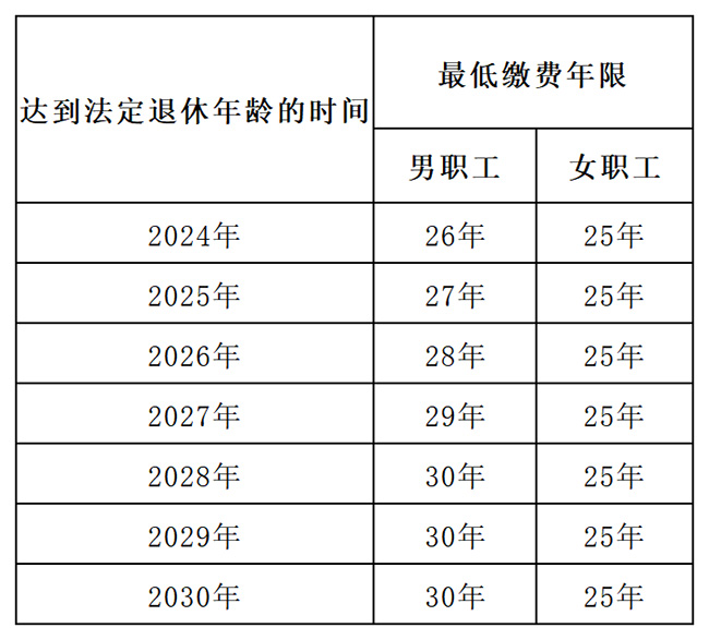 從2030年1月1日起,男職工為30年,女職工為25年。 2018年1月1日后(含1月1日)在本市首次參加職工醫保(2018年1月1日前從未參加過本市職工醫保)的參保人,最低累計繳費年限為: