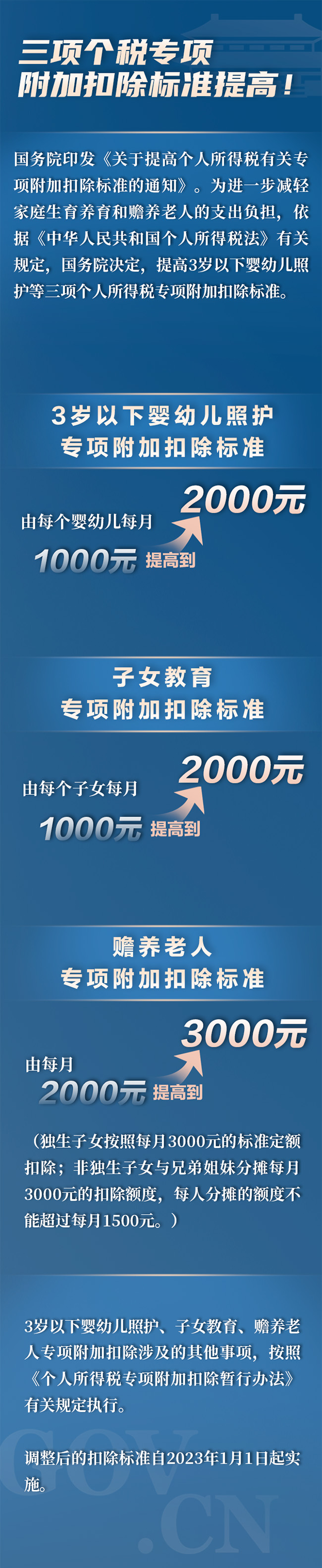 關于提高個人所得稅有關專項附加扣除標準的通知 8月28日,為進一步減輕家庭生育養(yǎng)育和贍養(yǎng)老人的支出負擔,依據《中華人民共和國個人所得稅法》有關規(guī)定,國務院決定,提高3歲以下嬰幼兒照護等三項個人所得稅專項附加扣除標準。 為進一步減輕家庭生育養(yǎng)育和贍養(yǎng)老人的支出負擔,依據《中華人民共和國個人所得稅法》有關規(guī)定,國務院決定,提高3歲以下嬰幼兒照護等三項個人所得稅專項附加扣除標準。現將有關事項通知如下: 一、3歲以下嬰幼兒照護專項附加扣除標準,由每個嬰幼兒每月1000元提高到2000元。 二、子女教育專項附加扣除標準,由每個子女每月1000元提高到2000元。 三、贍養(yǎng)老人專項附加扣除標準,由每月2000元提高到3000元。其中,獨生子女按照每月3000元的標準定額扣除;非獨生子女與兄弟姐妹分攤每月3000元的扣除額度,每人分攤的額度不能超過每月1500元。 四、3歲以下嬰幼兒照護、子女教育、贍養(yǎng)老人專項附加扣除涉及的其他事項,按照《個人所得稅專項附加扣除暫行辦法》有關規(guī)定執(zhí)行。 五、上述調整后的扣除標準自2023年1月1日起實施。