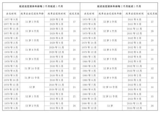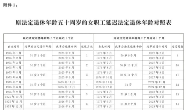 從2025年1月1日起,原法定退休年齡為五十周歲的女職工,法定退休年齡每二個月延遲一個月,逐步延遲至五十五周歲。國家另有規定的,從其規定。