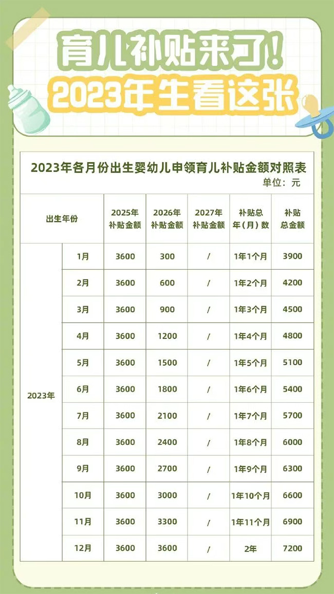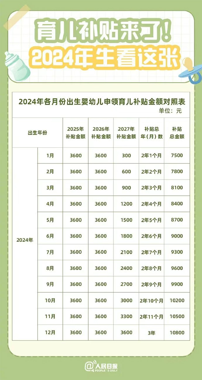 1.對于2025年1月1日及以后出生的嬰幼兒,可連續申領3年補貼,共計10800元。