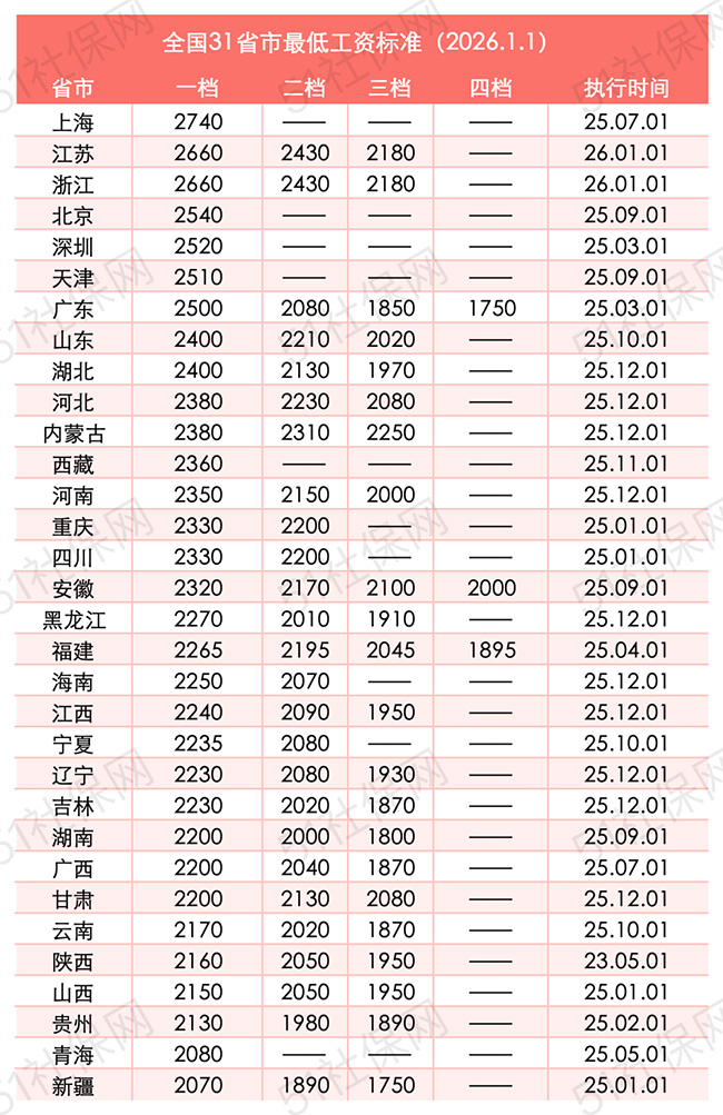 2026年1月1日起,多地已按照最低工資新標準執行。趕緊一起來看看~ 01、全國31省最新工資標準 截止2026年1月1日,全國31省最低工資如下表: