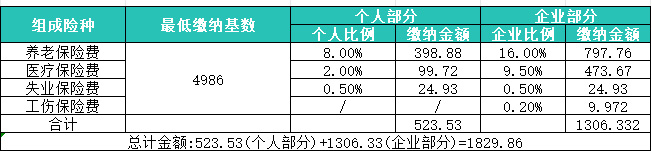 企業職工每個月最低繳納多少?(以最低繳費基數4986為例) 4986×8%(養老保險)+4986×0.5%(失業保險)+4986×2%(醫療保險)=523.53元/月